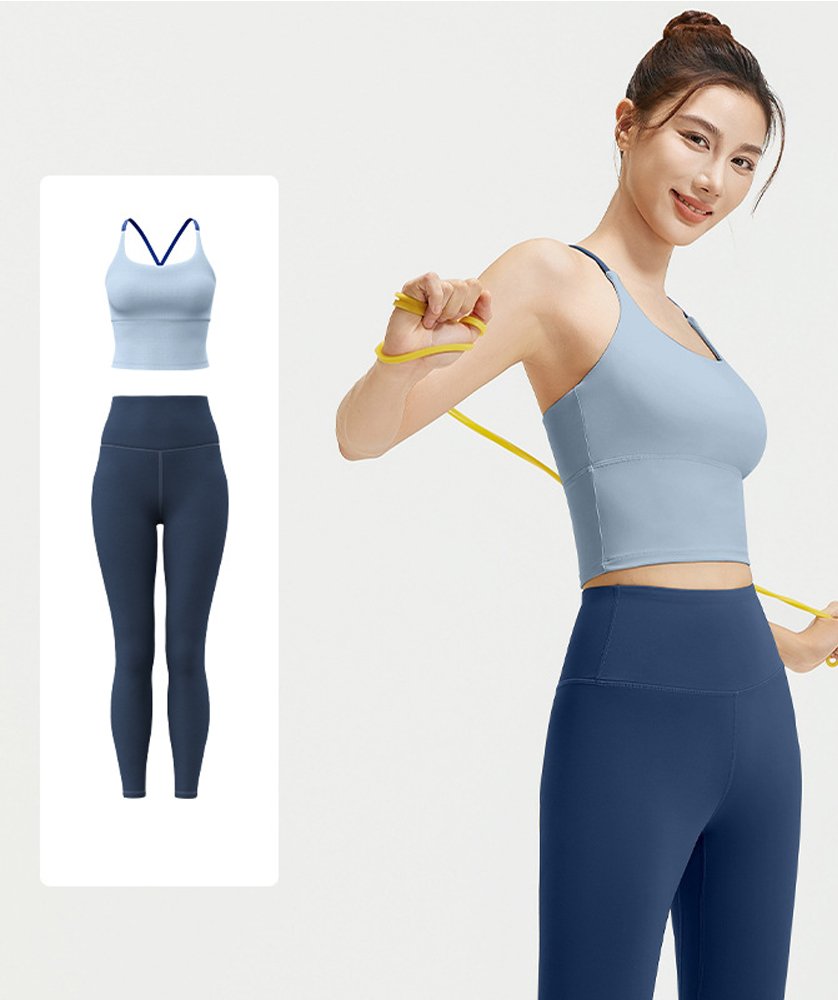 Women’s yoga set: slate blue tank + whale blue leggings. Ultra-soft, 4-way stretch fabric delivers flexibility and comfort. Racerback tank enhances breathability; high-waisted leggings with tummy control and non-slip waistband. Flatlock seams prevent chafing. Fresh, cohesive blue tones blend style and performance—perfect for yoga, workouts, or loungewear.