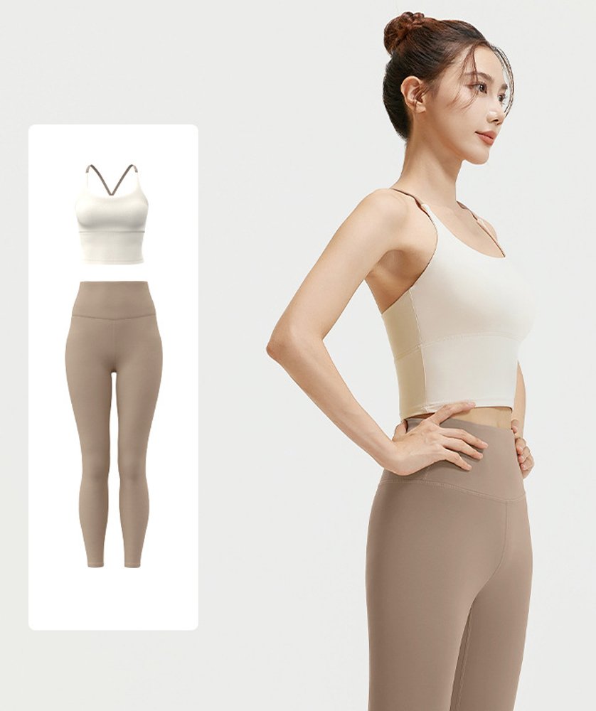 Women’s yoga set: ivory tank top + khaki leggings. Crafted with buttery-soft, 4-way stretch fabric for unrestricted movement. Racerback tank boosts breathability; high-waisted leggings feature tummy control and a non-slip waistband. Flatlock seams prevent chafing. Timeless neutral hues merge style and performance—ideal for yoga, workouts, or casual outings.
